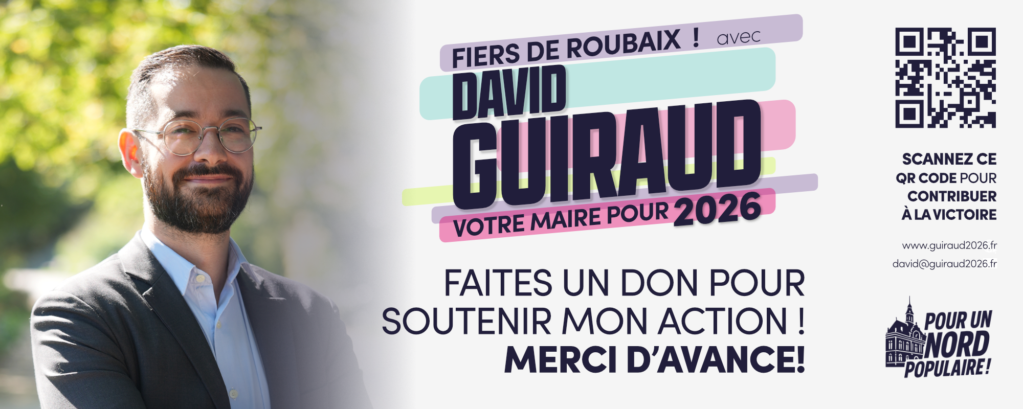 Pour toute demande d'aide technique ou de gestion de votre don, contactez-nous à david@guiraud2026.fr. Les dons sont destinés à l'Association de Financement Pour un Nord Populaire, déclarée à la préfecture du Nord en Mai 2025, seule habilitée à recevoir les dons en faveur de Pour un Nord Popualire. Un reçu détaché d’une formule numérotée vous sera directement adressé. Tout don de personne morale (entreprise, association, SCI, compte professionnel de professions libérales ou de commerçants…) est interdit. Vos dons sont indispensables notamment pour louer un local, organiser des événements, acheter du matériel, imprimer des affiches, des tracts... Ils nous aident à financer l'action politique de David GUIRAUD et de son équipe Pour un Nord Populaire.